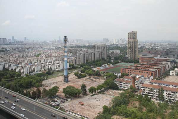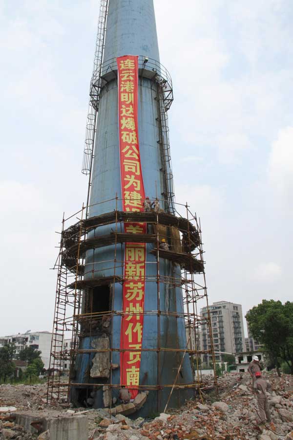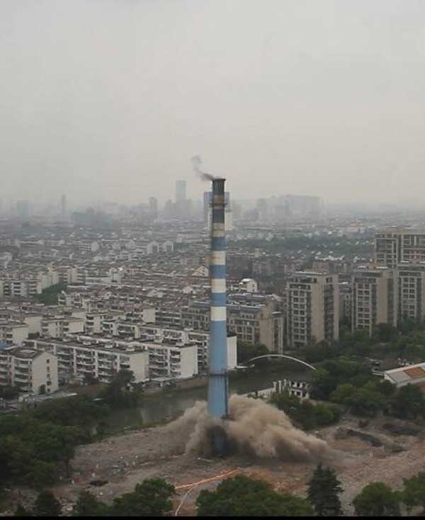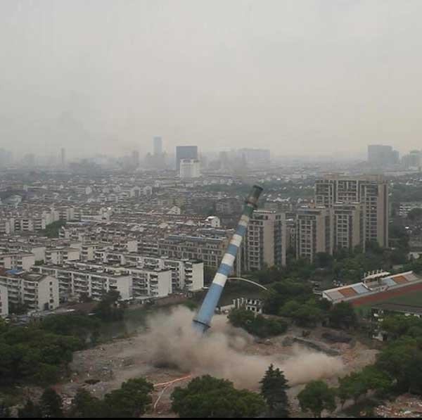 蘇州市地標建筑之一,矗立在蘇州城南的蘇州熱電廠大煙囪,該煙囪高80m,周圍有小區(qū)、學校、高架橋、小商品市場,爆破環(huán)境復雜。我公司技術(shù)人員仔細勘察現(xiàn)場后,編制詳細的爆破方案。最終于2016年8月26日下午3點整實施爆破拆除,伴隨蘇州人33年的電熱廠大煙囪從此成為歷史。
