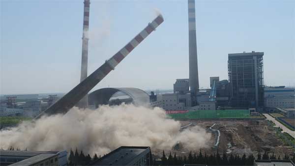 2017年5月18日14時28分,連云港明達工程爆破有限公司成功拆除了射陽港發(fā)電有限公司內(nèi)的兩座煙囪。煙囪按設(shè)定方位傾倒,整個爆破取得圓滿成功,此次爆破為江蘇省內(nèi)完成的首例同時爆破拆除兩座高達150m的混凝土煙囪。